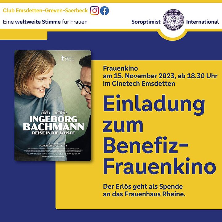 Der Soroptimistinnen Club Emsdetten-Greven-Saerbeck hat erneut einen wunderbaren Kinoabend mit dem Film „Ingeborg Bachmann – Reise in die Wüste“ veranstaltet. Die Resonanz war wieder sehr groß, zwei Kinosäle waren mit fast 200 Frauen und auch einigen Männern gefüllt. „Aus dem Kartenverkauf und weiteren Spenden ergibt sich ein Erlös von 1.000€, der erneut dem Frauenhaus in Rheine zugute kommt“, berichtet Präsidentin Uta Wedi mit Stolz. Alle Erlöse aus Veranstaltungen des Club gehen gezielt in Projekte, die die Belange von Mädchen und Frauen unterstützen. Die Notwendigkeit des Frauenhauses in Rheine mit Einzugsgebiet für den gesamten Kreis Steinfurt mit 464.000 Einwohnerinnen und Einwohnerinnen steht außer Frage. Das Haus besitzt gerade einmal 19 Plätze für 8 Frauen mit ihren Kindern. Die Kapazitäten reichen bei weitem nicht aus. Zudem ist das Frauenhaus auch für seine inhaltliche Arbeit stets auf Spenden angewiesen. Der Club spendet seit seiner Gründung 2007 regelmäßig für diese wichtige Einrichtung. Im Kreistag findet aktuell eine Beratung zu Neubau und vor allen Dingen der Kapazitätserweiterung statt. Der Soroptimistinnen Club Emsdetten-Greven-Saerbeck begrüßt das in besonderer Weise und hofft auf eine zukunftsweisende Entscheidung.