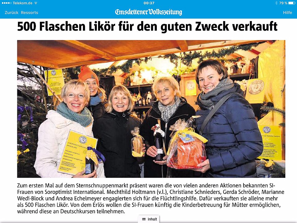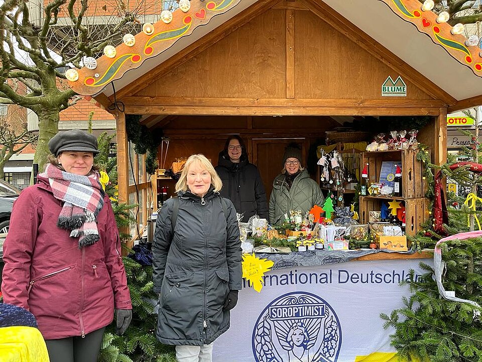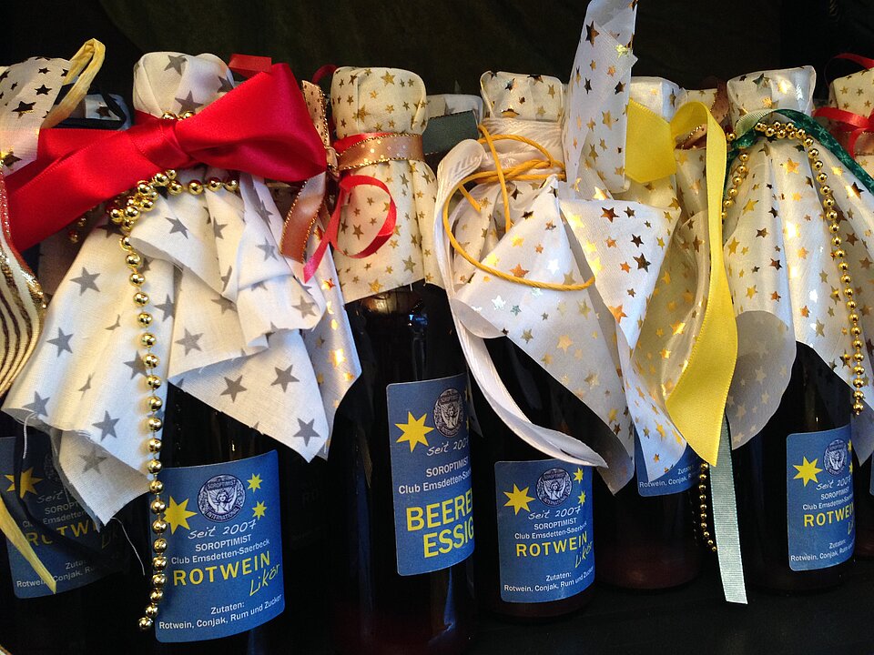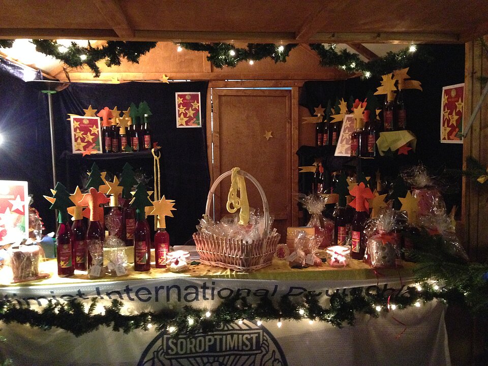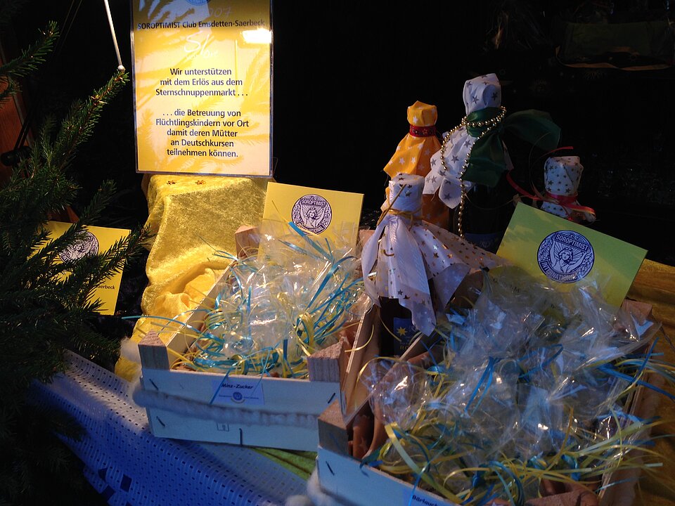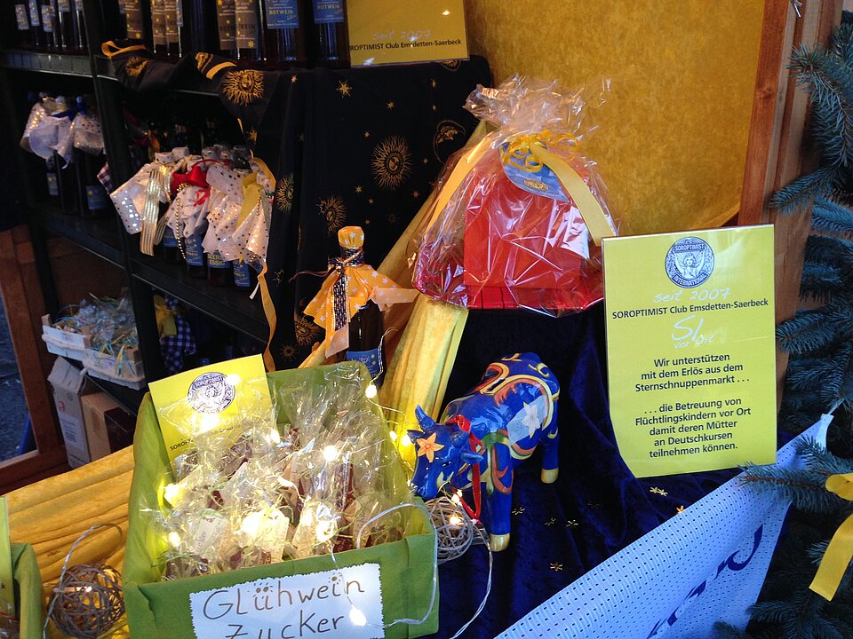 Auch dieses Jahr sind die Frauen von Soroptimist Club Emsdetten-Greven-Saerbeck wieder mit einem Stand auf dem Sternschnuppenmarkt in Emsdetten vertreten. Hier finden Sie neben den leckeren, frisch gebackenen Lolliwaffeln am Stiel, auch feine Weihnachtspräsente. Der beliebte Rotweinlikör, edle Essige, fruchtige Konfitüren, leckeres Gebäck, schöne Strickwaren und vieles mehr. Alles ist liebevoll verpackt und wartet auf viele Käuferinnen und Käufer.